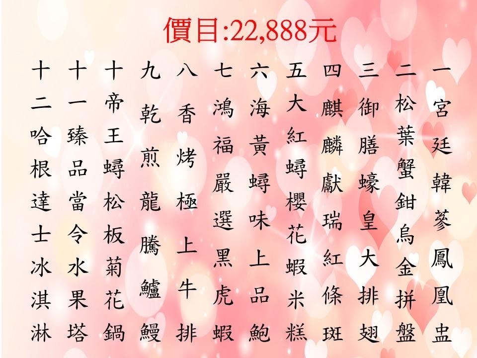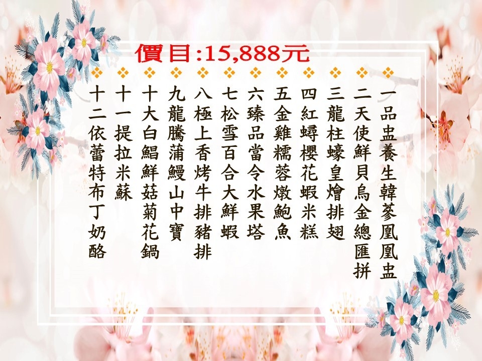(限喜宴場內飲用,恕不折現、扣抵或外帶)